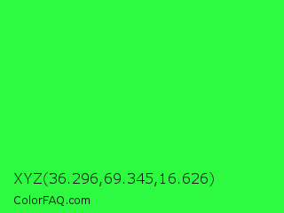 XYZ 36.296,69.345,16.626 Color is a normal green color and the nearest color is Neon Green #39ff14. Hex code #2efa42 and RGB value is rgb(46,250,66). In RGB color space, this color is composed of 18% red, 98% green, 26% blue, In CMYK color space, this color is composed of 82% cyan, 0% magenta, 74% yellow , 2% black , In HSL color space, this color has a hue angle of 126° , 95% saturation and 58% lightness.