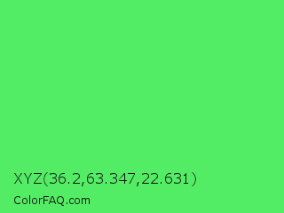 XYZ 36.2,63.347,22.631 Color is a light green color and the nearest color is Screamin Green #66ff66. Hex code #53ed65 and RGB value is rgb(83,237,101). In RGB color space, this color is composed of 33% red, 93% green, 40% blue, In CMYK color space, this color is composed of 65% cyan, 0% magenta, 57% yellow , 7% black , In HSL color space, this color has a hue angle of 127° , 81% saturation and 63% lightness.