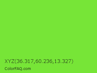 XYZ 36.317,60.236,13.327 Color is a normal green color and the nearest color is Kiwi #8ee53f. Hex code #77e537 and RGB value is rgb(119,229,55). In RGB color space, this color is composed of 47% red, 90% green, 22% blue, In CMYK color space, this color is composed of 48% cyan, 0% magenta, 76% yellow , 10% black , In HSL color space, this color has a hue angle of 98° , 77% saturation and 56% lightness.