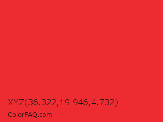 XYZ 36.322,19.946,4.732 Color is a normal red color and the nearest color is Imperial Red #ed2939. Hex code #ed2b30 and RGB value is rgb(237,43,48). In RGB color space, this color is composed of 93% red, 17% green, 19% blue, In CMYK color space, this color is composed of 0% cyan, 82% magenta, 80% yellow , 7% black , In HSL color space, this color has a hue angle of 358° , 84% saturation and 55% lightness.