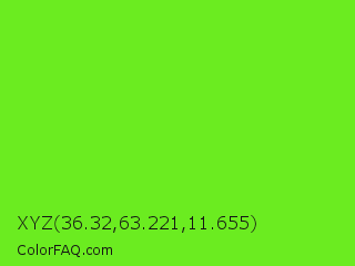 XYZ 36.32,63.221,11.655 Color is a normal green color and the nearest color is Spring Frost #87ff2a. Hex code #6bec20 and RGB value is rgb(107,236,32). In RGB color space, this color is composed of 42% red, 93% green, 13% blue, In CMYK color space, this color is composed of 55% cyan, 0% magenta, 86% yellow , 7% black , In HSL color space, this color has a hue angle of 98° , 84% saturation and 53% lightness.