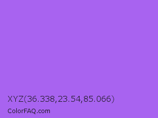 XYZ 36.338,23.54,85.066 Color is a light violet color and the nearest color is Navy Purple #9457eb. Hex code #a863f0 and RGB value is rgb(168,99,240). In RGB color space, this color is composed of 66% red, 39% green, 94% blue, In CMYK color space, this color is composed of 30% cyan, 59% magenta, 0% yellow , 6% black , In HSL color space, this color has a hue angle of 269° , 82% saturation and 66% lightness.