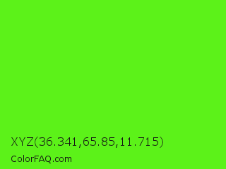 XYZ 36.341,65.85,11.715 Color is a normal green color and the nearest color is Bright Green #66ff00. Hex code #5cf219 and RGB value is rgb(92,242,25). In RGB color space, this color is composed of 36% red, 95% green, 10% blue, In CMYK color space, this color is composed of 62% cyan, 0% magenta, 90% yellow , 5% black , In HSL color space, this color has a hue angle of 101° , 89% saturation and 52% lightness.