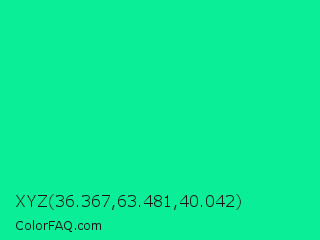 XYZ 36.367,63.481,40.042 Color is a normal green color and the nearest color is Medium Spring Green #00fa9a. Hex code #0aee98 and RGB value is rgb(10,238,152). In RGB color space, this color is composed of 4% red, 93% green, 60% blue, In CMYK color space, this color is composed of 96% cyan, 0% magenta, 36% yellow , 7% black , In HSL color space, this color has a hue angle of 157° , 92% saturation and 49% lightness.
