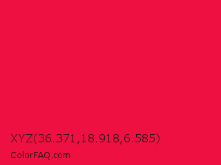 XYZ 36.371,18.918,6.585 Color is a normal red color and the nearest color is Red Ribbon #ed0a3f. Hex code #ee1040 and RGB value is rgb(238,16,64). In RGB color space, this color is composed of 93% red, 6% green, 25% blue, In CMYK color space, this color is composed of 0% cyan, 93% magenta, 73% yellow , 7% black , In HSL color space, this color has a hue angle of 347° , 87% saturation and 50% lightness.