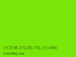 XYZ 36.372,60.751,10.068 Color is a normal green color and the nearest color is Alien Armpit #84de02. Hex code #7ae609 and RGB value is rgb(122,230,9). In RGB color space, this color is composed of 48% red, 90% green, 4% blue, In CMYK color space, this color is composed of 47% cyan, 0% magenta, 96% yellow , 10% black , In HSL color space, this color has a hue angle of 89° , 92% saturation and 47% lightness.