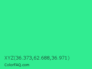 XYZ 36.373,62.688,36.971 Color is a normal green color and the nearest color is Shamrock #33cc99. Hex code #31ec91 and RGB value is rgb(49,236,145). In RGB color space, this color is composed of 19% red, 93% green, 57% blue, In CMYK color space, this color is composed of 79% cyan, 0% magenta, 39% yellow , 7% black , In HSL color space, this color has a hue angle of 151° , 83% saturation and 56% lightness.