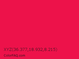 XYZ 36.377,18.932,8.215 Color is a normal red color and the nearest color is Spanish Crimson #e51a4c. Hex code #ed124a and RGB value is rgb(237,18,74). In RGB color space, this color is composed of 93% red, 7% green, 29% blue, In CMYK color space, this color is composed of 0% cyan, 92% magenta, 69% yellow , 7% black , In HSL color space, this color has a hue angle of 345° , 86% saturation and 50% lightness.