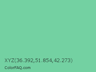 XYZ 36.392,51.854,42.273 Color is a light green color and the nearest color is Medium Aquamarine #66ddaa. Hex code #73d1a2 and RGB value is rgb(115,209,162). In RGB color space, this color is composed of 45% red, 82% green, 64% blue, In CMYK color space, this color is composed of 45% cyan, 0% magenta, 22% yellow , 18% black , In HSL color space, this color has a hue angle of 150° , 51% saturation and 64% lightness.