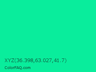 XYZ 36.398,63.027,41.7 Color is a normal green color and the nearest color is Medium Spring Green #00fa9a. Hex code #09ed9c and RGB value is rgb(9,237,156). In RGB color space, this color is composed of 4% red, 93% green, 61% blue, In CMYK color space, this color is composed of 96% cyan, 0% magenta, 34% yellow , 7% black , In HSL color space, this color has a hue angle of 159° , 93% saturation and 48% lightness.