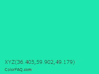 XYZ 36.405,59.902,49.179 Color is a normal green color and the nearest color is Turquoise PWG #30d5c8. Hex code #1fe6ad and RGB value is rgb(31,230,173). In RGB color space, this color is composed of 12% red, 90% green, 68% blue, In CMYK color space, this color is composed of 87% cyan, 0% magenta, 25% yellow , 10% black , In HSL color space, this color has a hue angle of 163° , 80% saturation and 51% lightness.