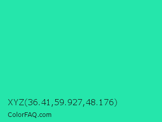 XYZ 36.41,59.927,48.176 Color is a normal green color and the nearest color is Eucalyptus #44d7a8. Hex code #25e6ab and RGB value is rgb(37,230,171). In RGB color space, this color is composed of 15% red, 90% green, 67% blue, In CMYK color space, this color is composed of 84% cyan, 0% magenta, 26% yellow , 10% black , In HSL color space, this color has a hue angle of 162° , 79% saturation and 52% lightness.