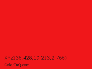XYZ 36.428,19.213,2.766 Color is a normal red color and the nearest color is Red Pigment #ed1c24. Hex code #f0171a and RGB value is rgb(240,23,26). In RGB color space, this color is composed of 94% red, 9% green, 10% blue, In CMYK color space, this color is composed of 0% cyan, 90% magenta, 89% yellow , 6% black , In HSL color space, this color has a hue angle of 359° , 88% saturation and 52% lightness.