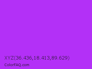 XYZ 36.436,18.413,89.629 Color is a normal purple color and the nearest color is Veronica #a020f0. Hex code #b330f7 and RGB value is rgb(179,48,247). In RGB color space, this color is composed of 70% red, 19% green, 97% blue, In CMYK color space, this color is composed of 28% cyan, 81% magenta, 0% yellow , 3% black , In HSL color space, this color has a hue angle of 279° , 93% saturation and 58% lightness.