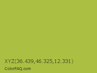 XYZ 36.439,46.325,12.331 Color is a normal yellow color and the nearest color is Android Green #a4c639. Hex code #abbf43 and RGB value is rgb(171,191,67). In RGB color space, this color is composed of 67% red, 75% green, 26% blue, In CMYK color space, this color is composed of 10% cyan, 0% magenta, 65% yellow , 25% black , In HSL color space, this color has a hue angle of 70° , 49% saturation and 51% lightness.
