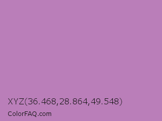 XYZ 36.468,28.864,49.548 Color is a light magenta color and the nearest color is African Violet #b284be. Hex code #ba7eb9 and RGB value is rgb(186,126,185). In RGB color space, this color is composed of 73% red, 49% green, 73% blue, In CMYK color space, this color is composed of 0% cyan, 32% magenta, 1% yellow , 27% black , In HSL color space, this color has a hue angle of 301° , 30% saturation and 61% lightness.
