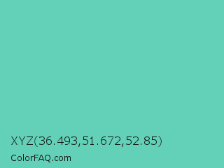 XYZ 36.493,51.672,52.85 Color is a normal cyan color and the nearest color is Medium Aquamarine #66ddaa. Hex code #63d1b7 and RGB value is rgb(99,209,183). In RGB color space, this color is composed of 39% red, 82% green, 72% blue, In CMYK color space, this color is composed of 53% cyan, 0% magenta, 12% yellow , 18% black , In HSL color space, this color has a hue angle of 166° , 54% saturation and 60% lightness.