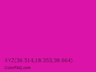 XYZ 36.514,18.353,38.664 Color is a normal magenta color and the nearest color is Hollywood Cerise #f400a1. Hex code #db13a8 and RGB value is rgb(219,19,168). In RGB color space, this color is composed of 86% red, 7% green, 66% blue, In CMYK color space, this color is composed of 0% cyan, 91% magenta, 23% yellow , 14% black , In HSL color space, this color has a hue angle of 315° , 84% saturation and 47% lightness.