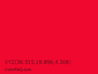 XYZ 36.515,18.896,4.308 Color is a normal red color and the nearest color is Medium Candy Apple Red #e2062c. Hex code #f0082e and RGB value is rgb(240,8,46). In RGB color space, this color is composed of 94% red, 3% green, 18% blue, In CMYK color space, this color is composed of 0% cyan, 97% magenta, 81% yellow , 6% black , In HSL color space, this color has a hue angle of 350° , 94% saturation and 49% lightness.