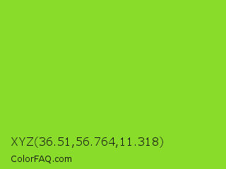 XYZ 36.51,56.764,11.318 Color is a normal green color and the nearest color is Atlantis #97cd2d. Hex code #8adc2b and RGB value is rgb(138,220,43). In RGB color space, this color is composed of 54% red, 86% green, 17% blue, In CMYK color space, this color is composed of 37% cyan, 0% magenta, 80% yellow , 14% black , In HSL color space, this color has a hue angle of 88° , 72% saturation and 52% lightness.
