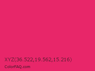 XYZ 36.522,19.562,15.216 Color is a normal rose color and the nearest color is Razzmatazz #e3256b. Hex code #e82669 and RGB value is rgb(232,38,105). In RGB color space, this color is composed of 91% red, 15% green, 41% blue, In CMYK color space, this color is composed of 0% cyan, 84% magenta, 55% yellow , 9% black , In HSL color space, this color has a hue angle of 339° , 81% saturation and 53% lightness.