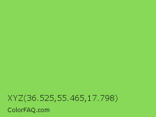 XYZ 36.525,55.465,17.798 Color is a normal green color and the nearest color is Kiwi #8ee53f. Hex code #87d957 and RGB value is rgb(135,217,87). In RGB color space, this color is composed of 53% red, 85% green, 34% blue, In CMYK color space, this color is composed of 38% cyan, 0% magenta, 60% yellow , 15% black , In HSL color space, this color has a hue angle of 98° , 63% saturation and 60% lightness.