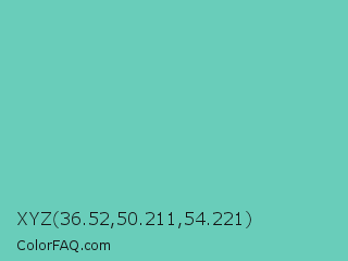 XYZ 36.52,50.211,54.221 Color is a light cyan color and the nearest color is Downy #6fd0c5. Hex code #69cdba and RGB value is rgb(105,205,186). In RGB color space, this color is composed of 41% red, 80% green, 73% blue, In CMYK color space, this color is composed of 49% cyan, 0% magenta, 9% yellow , 20% black , In HSL color space, this color has a hue angle of 169° , 50% saturation and 61% lightness.