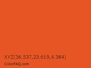 XYZ 36.537,23.619,4.384 Color is a normal color and the nearest color is Flame #e25822. Hex code #e75525 and RGB value is rgb(231,85,37). In RGB color space, this color is composed of 91% red, 33% green, 15% blue, In CMYK color space, this color is composed of 0% cyan, 63% magenta, 84% yellow , 9% black , In HSL color space, this color has a hue angle of 15° , 80% saturation and 53% lightness.