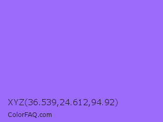 XYZ 36.539,24.612,94.92 Color is a light indigo color and the nearest color is Navy Purple #9457eb. Hex code #9c6bfc and RGB value is rgb(156,107,252). In RGB color space, this color is composed of 61% red, 42% green, 99% blue, In CMYK color space, this color is composed of 38% cyan, 58% magenta, 0% yellow , 1% black , In HSL color space, this color has a hue angle of 260° , 96% saturation and 70% lightness.