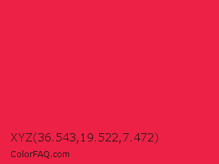 XYZ 36.543,19.522,7.472 Color is a normal red color and the nearest color is Red Crayola #ee204d. Hex code #ed2145 and RGB value is rgb(237,33,69). In RGB color space, this color is composed of 93% red, 13% green, 27% blue, In CMYK color space, this color is composed of 0% cyan, 86% magenta, 71% yellow , 7% black , In HSL color space, this color has a hue angle of 349° , 85% saturation and 53% lightness.