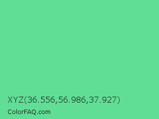XYZ 36.556,56.986,37.927 Color is a light green color and the nearest color is Very Light Malachite Green #64e986. Hex code #61de96 and RGB value is rgb(97,222,150). In RGB color space, this color is composed of 38% red, 87% green, 59% blue, In CMYK color space, this color is composed of 56% cyan, 0% magenta, 32% yellow , 13% black , In HSL color space, this color has a hue angle of 145° , 65% saturation and 63% lightness.