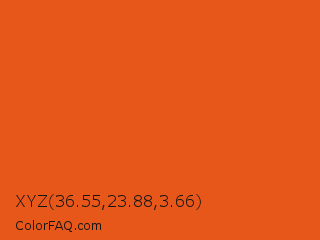 XYZ 36.55,23.88,3.66 Color is a normal orange color and the nearest color is Flame #e25822. Hex code #e7571a and RGB value is rgb(231,87,26). In RGB color space, this color is composed of 91% red, 34% green, 10% blue, In CMYK color space, this color is composed of 0% cyan, 62% magenta, 89% yellow , 9% black , In HSL color space, this color has a hue angle of 18° , 81% saturation and 50% lightness.