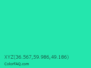 XYZ 36.567,59.986,49.186 Color is a normal green color and the nearest color is Turquoise PWG #30d5c8. Hex code #24e6ad and RGB value is rgb(36,230,173). In RGB color space, this color is composed of 14% red, 90% green, 68% blue, In CMYK color space, this color is composed of 84% cyan, 0% magenta, 25% yellow , 10% black , In HSL color space, this color has a hue angle of 162° , 80% saturation and 52% lightness.