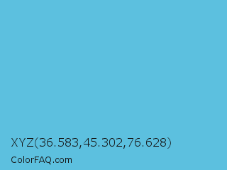 XYZ 36.583,45.302,76.628 Color is a light blue color and the nearest color is Viking #64ccdb. Hex code #5cc0df and RGB value is rgb(92,192,223). In RGB color space, this color is composed of 36% red, 75% green, 87% blue, In CMYK color space, this color is composed of 59% cyan, 14% magenta, 0% yellow , 13% black , In HSL color space, this color has a hue angle of 194° , 67% saturation and 62% lightness.