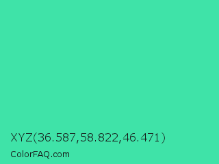 XYZ 36.587,58.822,46.471 Color is a normal green color and the nearest color is Eucalyptus #44d7a8. Hex code #3fe3a8 and RGB value is rgb(63,227,168). In RGB color space, this color is composed of 25% red, 89% green, 66% blue, In CMYK color space, this color is composed of 72% cyan, 0% magenta, 26% yellow , 11% black , In HSL color space, this color has a hue angle of 158° , 75% saturation and 57% lightness.