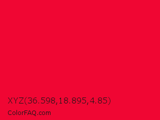 XYZ 36.598,18.895,4.85 Color is a normal red color and the nearest color is Red Munsell #f2003c. Hex code #f00633 and RGB value is rgb(240,6,51). In RGB color space, this color is composed of 94% red, 2% green, 20% blue, In CMYK color space, this color is composed of 0% cyan, 98% magenta, 79% yellow , 6% black , In HSL color space, this color has a hue angle of 348° , 95% saturation and 48% lightness.