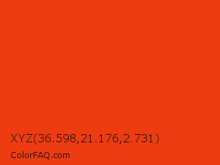 XYZ 36.598,21.176,2.731 Color is a normal red color and the nearest color is Pomegranate #f34723. Hex code #ed3b12 and RGB value is rgb(237,59,18). In RGB color space, this color is composed of 93% red, 23% green, 7% blue, In CMYK color space, this color is composed of 0% cyan, 75% magenta, 92% yellow , 7% black , In HSL color space, this color has a hue angle of 11° , 86% saturation and 50% lightness.