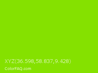 XYZ 36.598,58.837,9.428 Color is a normal green color and the nearest color is Alien Armpit #84de02. Hex code #85e100 and RGB value is rgb(133,225,0). In RGB color space, this color is composed of 52% red, 88% green, 0% blue, In CMYK color space, this color is composed of 41% cyan, 0% magenta, 100% yellow , 12% black , In HSL color space, this color has a hue angle of 85° , 100% saturation and 44% lightness.