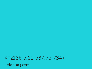 XYZ 36.5,51.537,75.734 Color is a normal cyan color and the nearest color is Scooter #2ebfd4. Hex code #1ed2dc and RGB value is rgb(30,210,220). In RGB color space, this color is composed of 12% red, 82% green, 86% blue, In CMYK color space, this color is composed of 86% cyan, 5% magenta, 0% yellow , 14% black , In HSL color space, this color has a hue angle of 183° , 76% saturation and 49% lightness.
