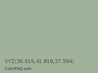 XYZ 36.619,41.818,37.594 Color is a light green color and the nearest color is Bud #a8ae9c. Hex code #a1b29c and RGB value is rgb(161,178,156). In RGB color space, this color is composed of 63% red, 70% green, 61% blue, In CMYK color space, this color is composed of 10% cyan, 0% magenta, 12% yellow , 30% black , In HSL color space, this color has a hue angle of 106° , 13% saturation and 65% lightness.