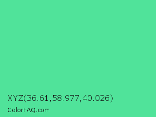 XYZ 36.61,58.977,40.026 Color is a normal green color and the nearest color is Eucalyptus #44d7a8. Hex code #50e39a and RGB value is rgb(80,227,154). In RGB color space, this color is composed of 31% red, 89% green, 60% blue, In CMYK color space, this color is composed of 65% cyan, 0% magenta, 32% yellow , 11% black , In HSL color space, this color has a hue angle of 150° , 72% saturation and 60% lightness.