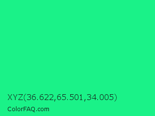 XYZ 36.622,65.501,34.005 Color is a normal green color and the nearest color is Spring Green #00ff7f. Hex code #1af288 and RGB value is rgb(26,242,136). In RGB color space, this color is composed of 10% red, 95% green, 53% blue, In CMYK color space, this color is composed of 89% cyan, 0% magenta, 44% yellow , 5% black , In HSL color space, this color has a hue angle of 151° , 89% saturation and 53% lightness.