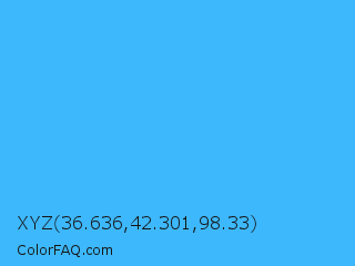 XYZ 36.636,42.301,98.33 Color is a light blue color and the nearest color is Picton Blue #45b1e8. Hex code #3db8fc and RGB value is rgb(61,184,252). In RGB color space, this color is composed of 24% red, 72% green, 99% blue, In CMYK color space, this color is composed of 76% cyan, 27% magenta, 0% yellow , 1% black , In HSL color space, this color has a hue angle of 201° , 97% saturation and 61% lightness.