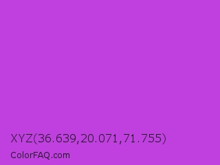 XYZ 36.639,20.071,71.755 Color is a normal purple color and the nearest color is Medium Orchid #ba55d3. Hex code #bf40df and RGB value is rgb(191,64,223). In RGB color space, this color is composed of 75% red, 25% green, 87% blue, In CMYK color space, this color is composed of 14% cyan, 71% magenta, 0% yellow , 13% black , In HSL color space, this color has a hue angle of 288° , 71% saturation and 56% lightness.