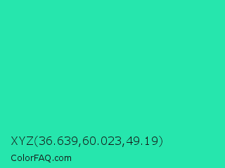 XYZ 36.639,60.023,49.19 Color is a normal green color and the nearest color is Turquoise PWG #30d5c8. Hex code #26e6ad and RGB value is rgb(38,230,173). In RGB color space, this color is composed of 15% red, 90% green, 68% blue, In CMYK color space, this color is composed of 83% cyan, 0% magenta, 25% yellow , 10% black , In HSL color space, this color has a hue angle of 162° , 79% saturation and 53% lightness.
