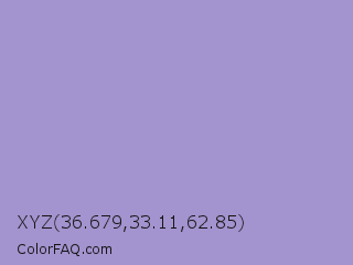 XYZ 36.679,33.11,62.85 Color is a light indigo color and the nearest color is East Side #ac91ce. Hex code #a393ce and RGB value is rgb(163,147,206). In RGB color space, this color is composed of 64% red, 58% green, 81% blue, In CMYK color space, this color is composed of 21% cyan, 29% magenta, 0% yellow , 19% black , In HSL color space, this color has a hue angle of 256° , 38% saturation and 69% lightness.