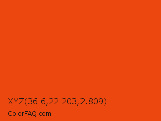 XYZ 36.6,22.203,2.809 Color is a normal color and the nearest color is Trinidad #e64e03. Hex code #eb470f and RGB value is rgb(235,71,15). In RGB color space, this color is composed of 92% red, 28% green, 6% blue, In CMYK color space, this color is composed of 0% cyan, 70% magenta, 94% yellow , 8% black , In HSL color space, this color has a hue angle of 15° , 88% saturation and 49% lightness.
