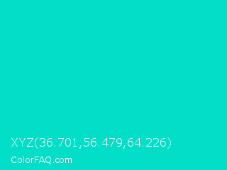 XYZ 36.701,56.479,64.226 Color is a normal cyan color and the nearest color is Dark Turquoise #00ced1. Hex code #03dec9 and RGB value is rgb(3,222,201). In RGB color space, this color is composed of 1% red, 87% green, 79% blue, In CMYK color space, this color is composed of 99% cyan, 0% magenta, 9% yellow , 13% black , In HSL color space, this color has a hue angle of 174° , 97% saturation and 44% lightness.