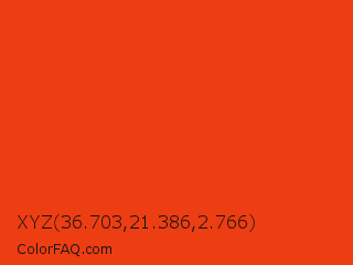 XYZ 36.703,21.386,2.766 Color is a normal red color and the nearest color is Pomegranate #f34723. Hex code #ed3d12 and RGB value is rgb(237,61,18). In RGB color space, this color is composed of 93% red, 24% green, 7% blue, In CMYK color space, this color is composed of 0% cyan, 74% magenta, 92% yellow , 7% black , In HSL color space, this color has a hue angle of 12° , 86% saturation and 50% lightness.
