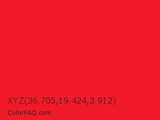 XYZ 36.705,19.424,3.912 Color is a normal red color and the nearest color is Red Pigment #ed1c24. Hex code #f01a29 and RGB value is rgb(240,26,41). In RGB color space, this color is composed of 94% red, 10% green, 16% blue, In CMYK color space, this color is composed of 0% cyan, 89% magenta, 83% yellow , 6% black , In HSL color space, this color has a hue angle of 356° , 88% saturation and 52% lightness.